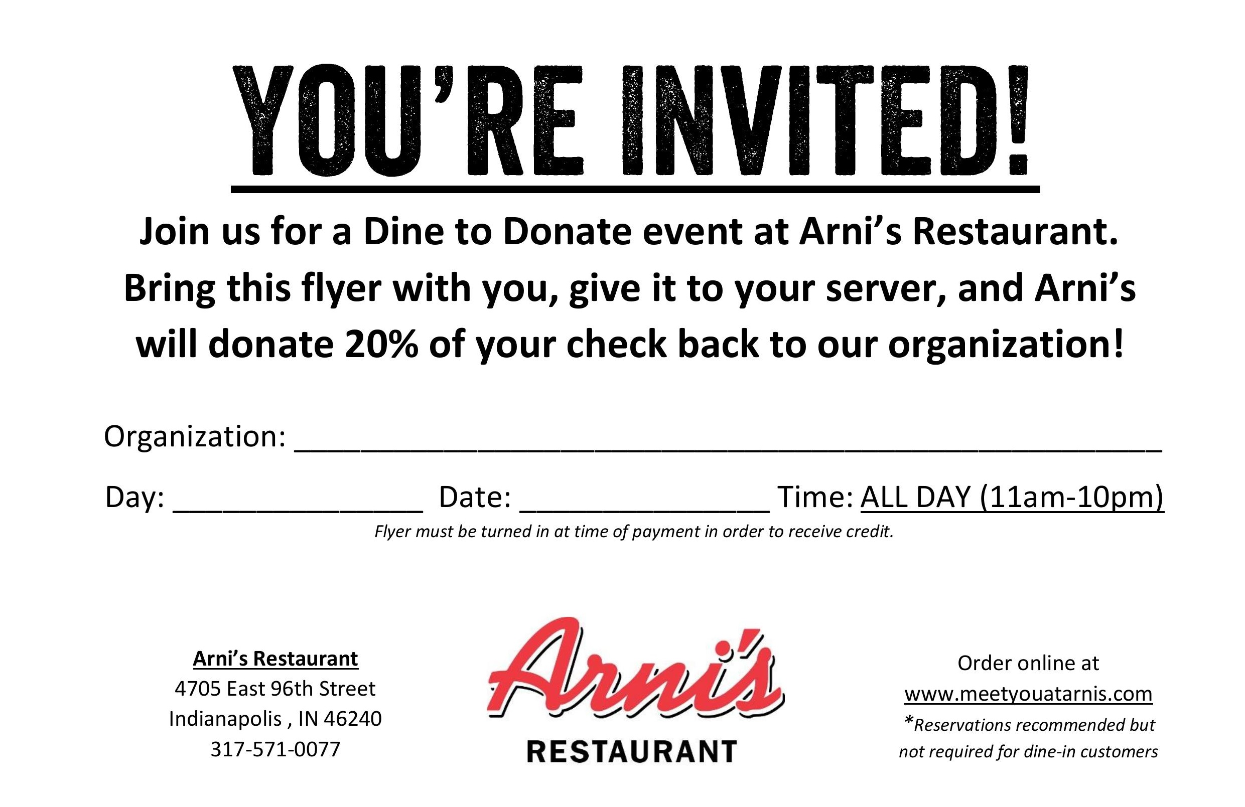Dine to Donate Event: Arni’s Restaurant